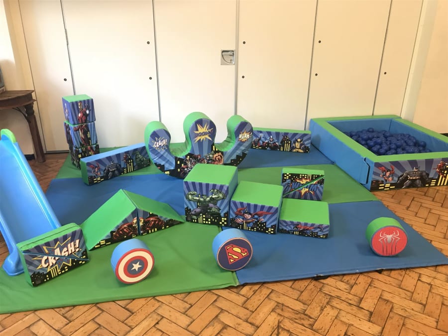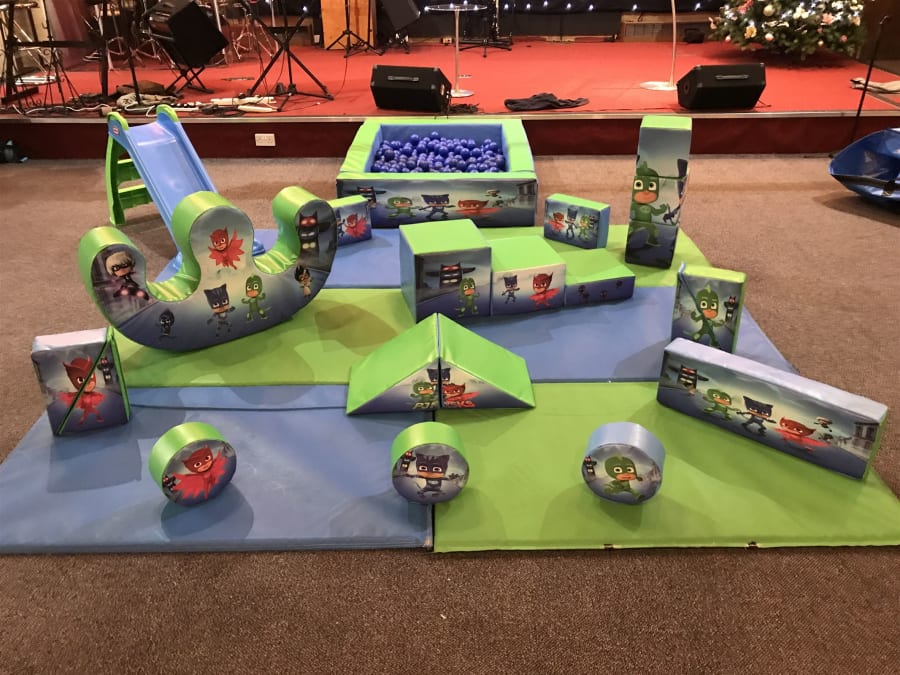 This package comprises of our 12 x 18 blue and green combo with any available theme and Peppa Pig, princess, Pj masks, Super hero and unicorn soft play, ball pond and Mini slide