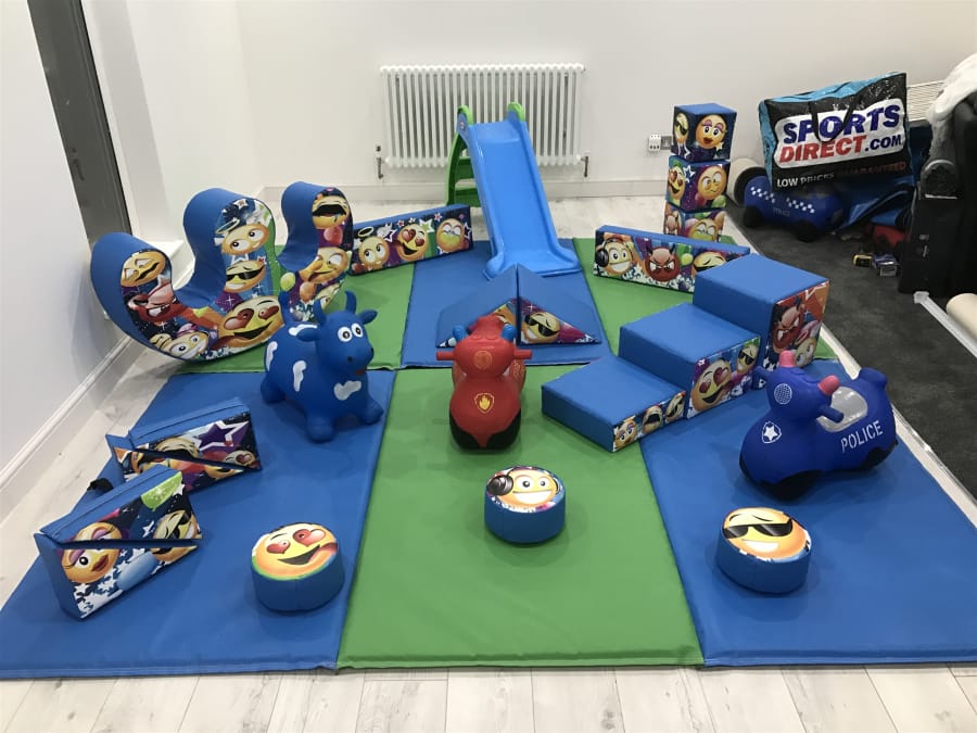 The set is compromising of a range of triangles, slopes, squares, steps, puzzle cubes, stepping stones and a two seat Rocker with pictures of your favorite Emoji on it.