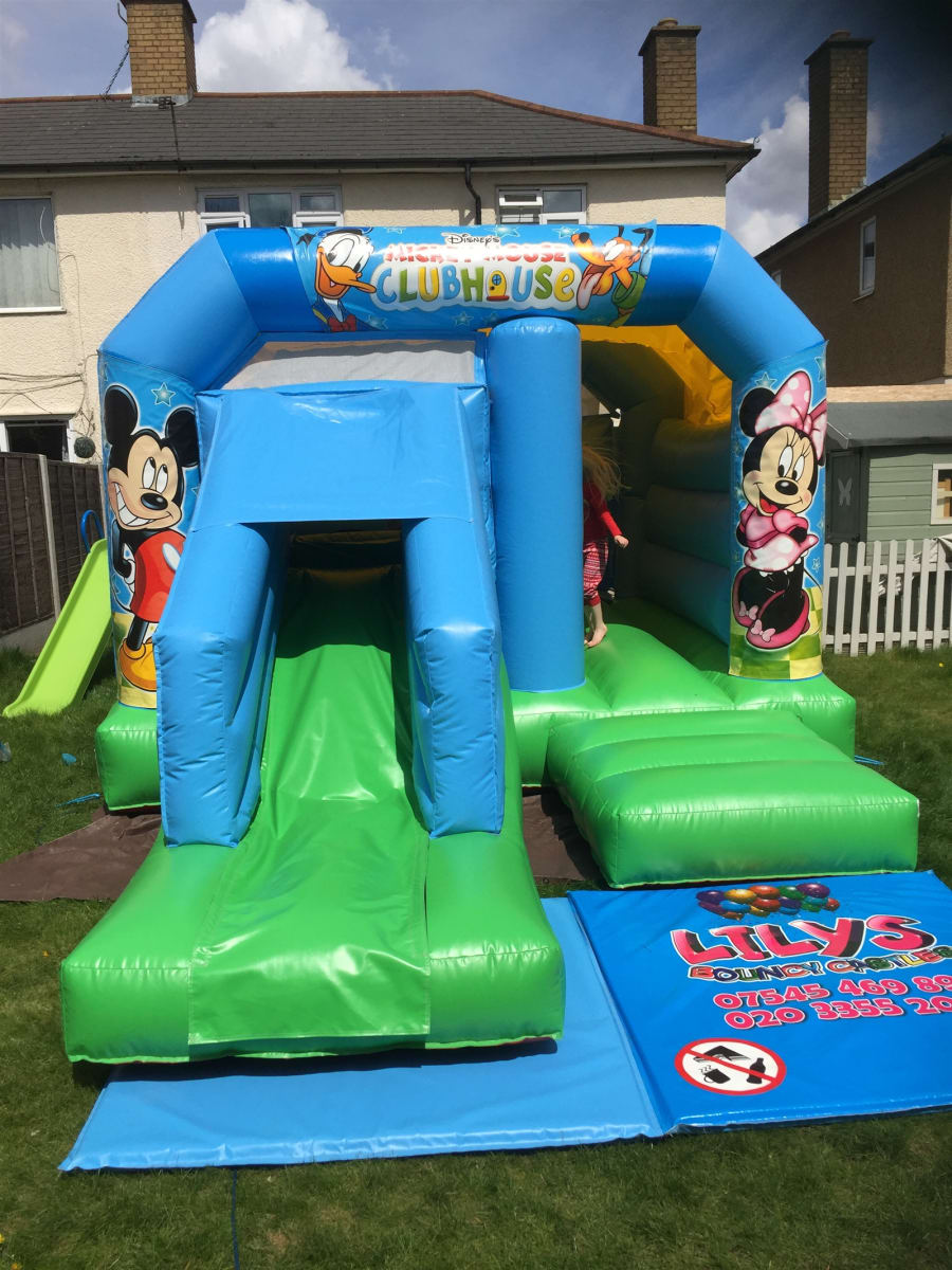 including picture of Mickey Mouse, Minnie Mouse, Donald Duck and Pluto in this bouncy castle with slide
