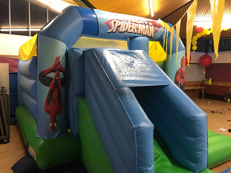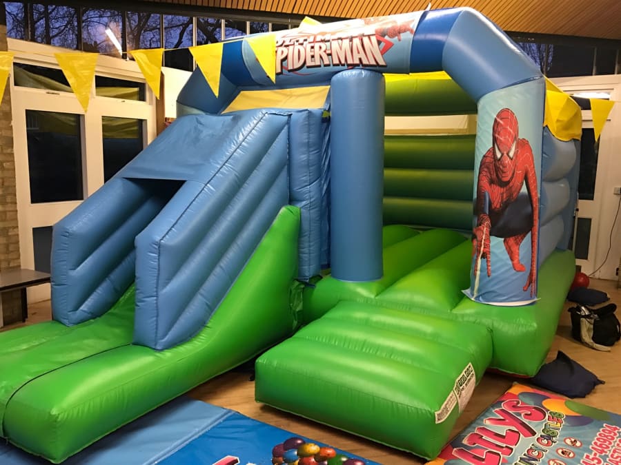Spider-man can hang around your party with this 12ft x 18ft blue bouncy castle with slide a must have theme for any spider-man fan.