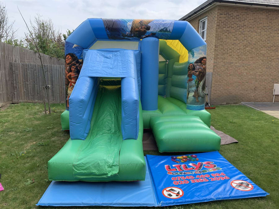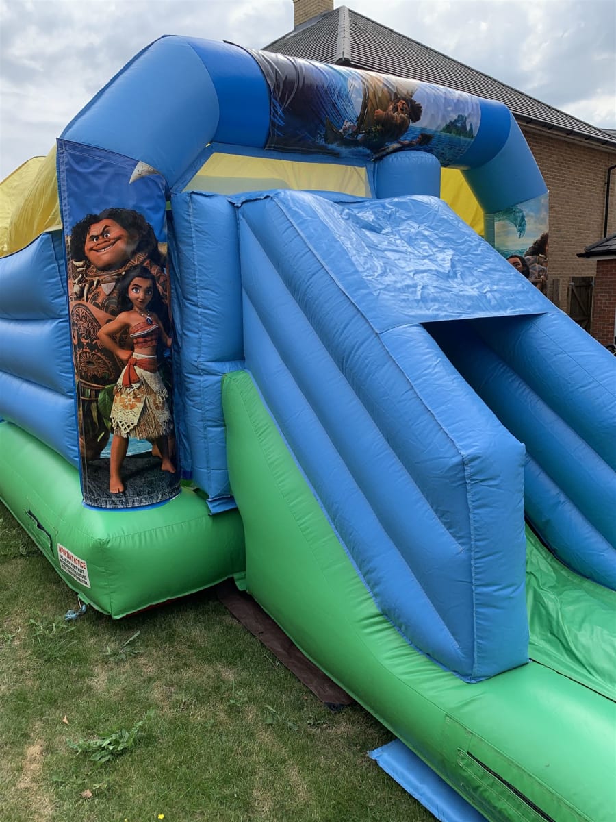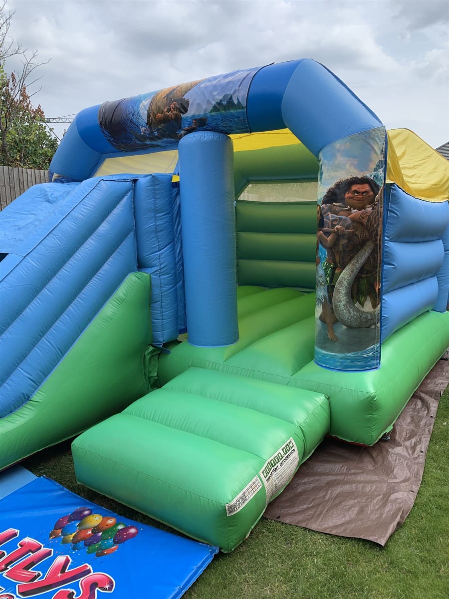 Our blue amd green Moana Combo bouncy castle ͏c͏o͏mEs complete with a 1m high Slide one the front and is great for all type parties. Whether it birthdays, christening. Bar mitzvahs, eid or just family get together.