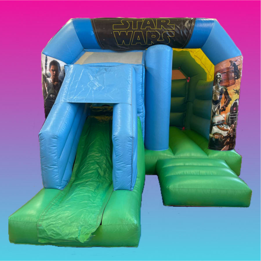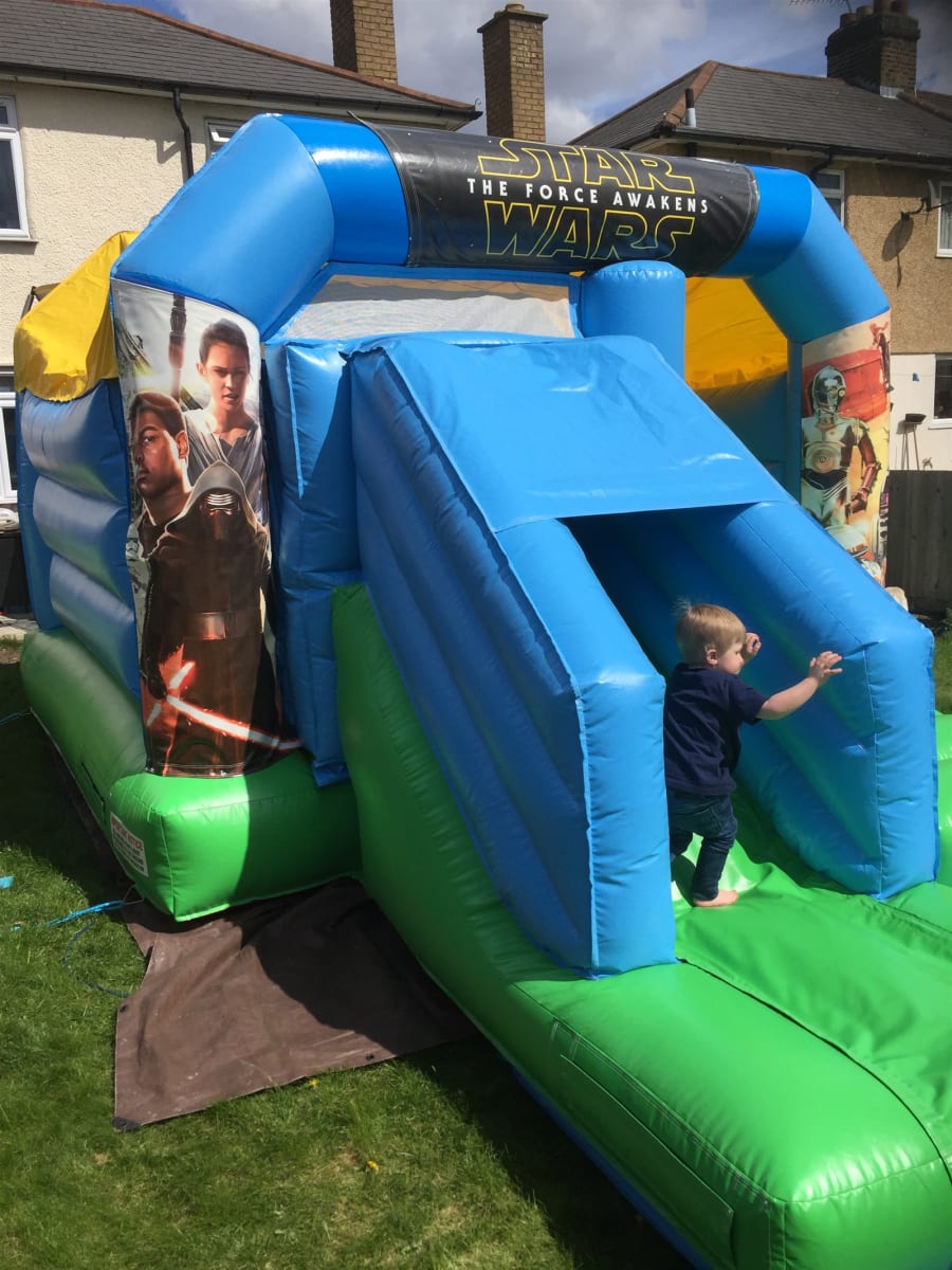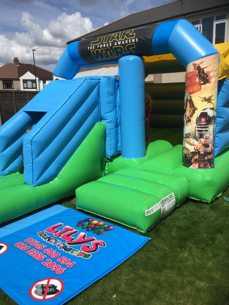 Our Star Wars The Force awakens Velcro set will be attached the front of or 'party fun' blue and green 12’ x 18’ - 3.66m x 5.5m combo slide bouncy castle. The pictures on the turrets and top banner are of the main characters from the film. Rely, Finn and Kylo Ren are on the right turret with Rey on her speeder bike, C3PO, R2D2, BB8 and then the first order flame trooper on the right hand turret