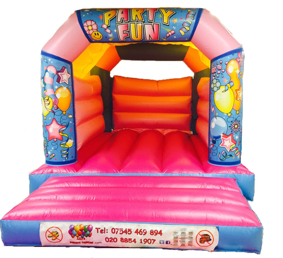 this castle is our party themed castle. Hire our Pink 'Party Fun' Velcro 11ft x 15ft Bouncy castle and receive a Free velcro theme to put on the front for the time of your party!! Peppa Pig*, Mickey Mouse*, Super Hero*, Pirate and In the nigfht garden* Minion* Hello Kitty* Toy Story* Clubhouse*, Princess and Frozen* or just as it is. The space required for the safe set up of this castle is a Flat, Even, Grassed (not dirt) area of 13ft (3.9m) wide X 21ft (6.4m) this includes the space for the blower and a mat. Why not add a gazebo to your hire Gazebo or maybe a bubble machineBubble Machine hire