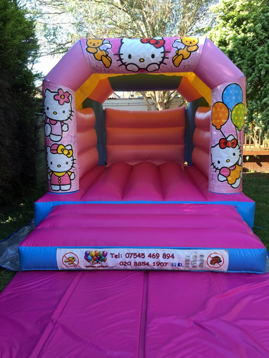This is a Hello Kitty* style bouncy Castle is based on the Hello Kitty character. It's Velcro panels has a number picture of hello kitty on. The castle itself is Pink with a pale blue surround on the base.