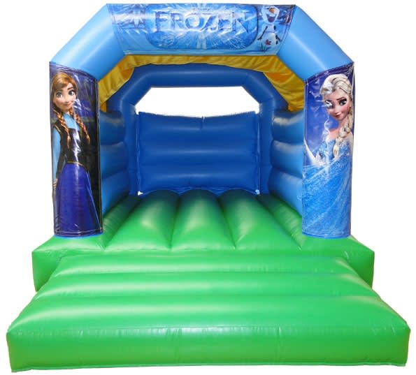 Our very popular Frozen style bouncy Castle has Anna and Elsa on the pillars. There is also Olaf on the top banner.