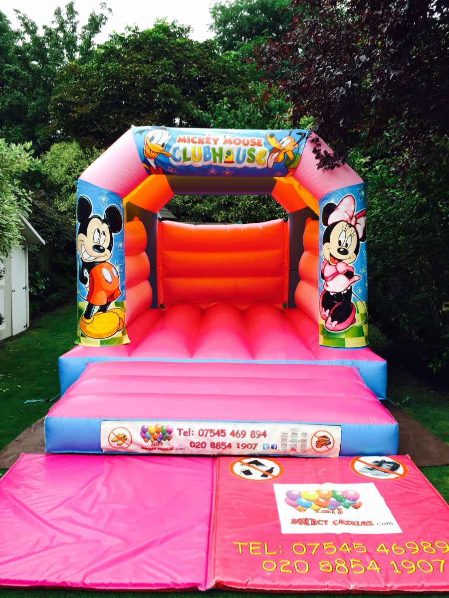 Our Pink 11ft x 15ft (3.35m x 4.57m) bouncy castle comes with our Mickey clubhouse theme attached to the front of the castle. The theme has images of Mickey on one front turret and Minnie on the other with Donald Duck and Pluto across the top banner.