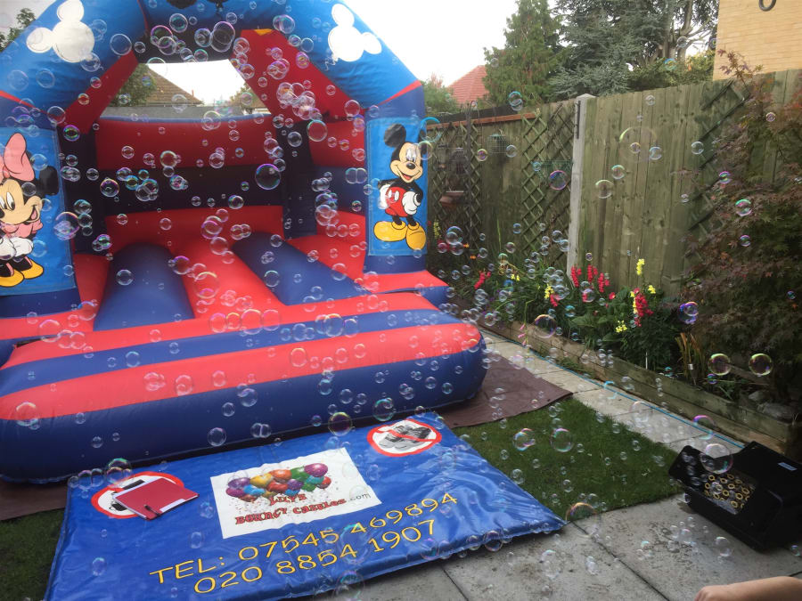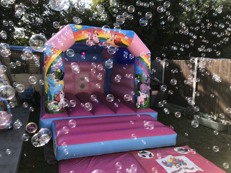 This bubble machine is available for £20 along with the hire of any bouncy castle. Once machine is set up to avoid spillage its best not to move around, Switch on the back to turn bubbles on and off. Bubble fluid will last up to an hour.