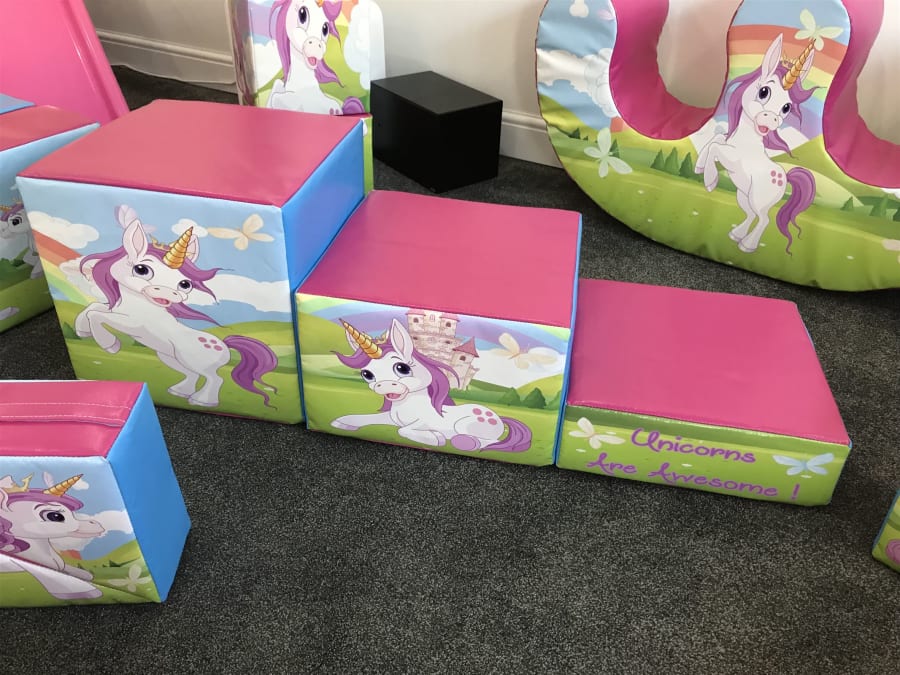 The set is compromising of a range of triangles, slopes, squares, steps, puzzle cubes, stepping stones and a two seat Rocker all with with pictures of Unicorns 🦄