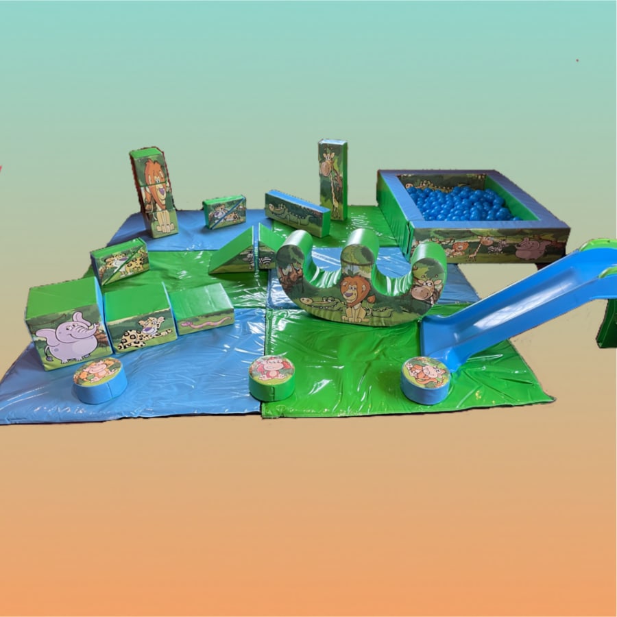 18 piece jungle themed Softplay, ball pond, two seater rocker and slide.